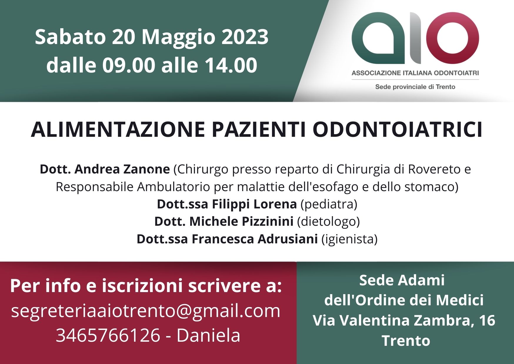 vi informiamo che il 20 Maggio 2023 presso la sala Adami dell’Ordine dei Medici, in Via Valentina Zambra 16, ci sarà un corso sull’alimentazione dei pazienti odontoiatrici.