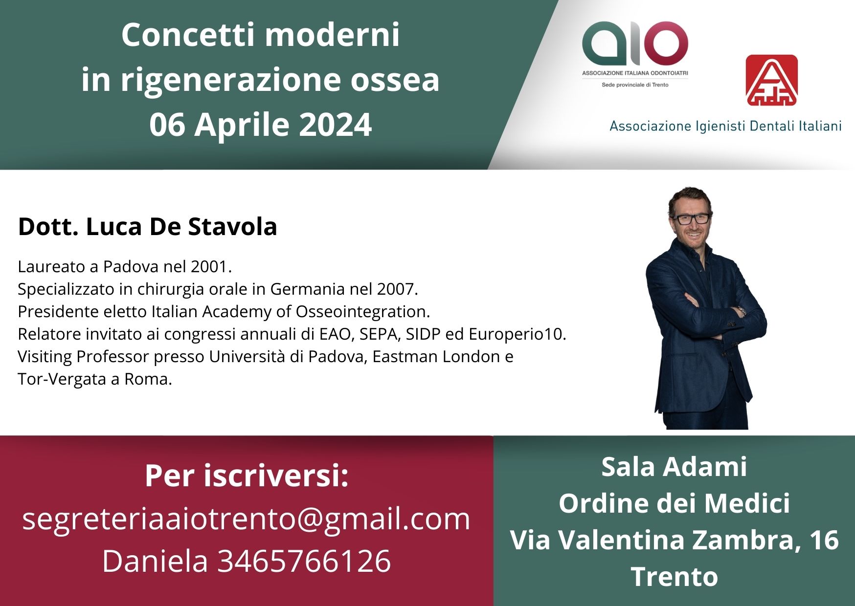 il 06 aprile 2024 a Trento il Dott. Luca De Stavola terrà un corso dal titolo “concetti moderni in rigenerazione ossea“.